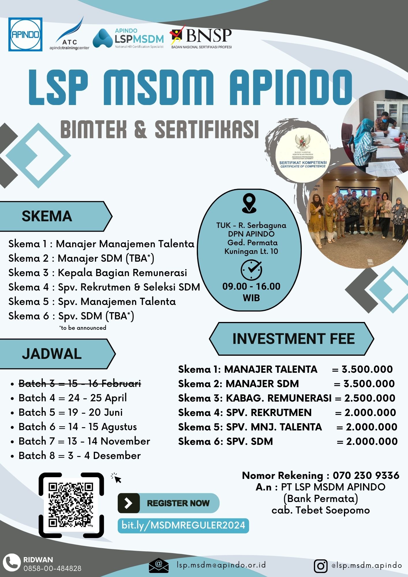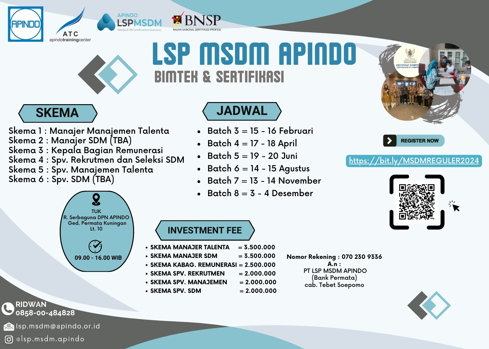 Bimtek + Sertifikasi LSP MSDM APINDO BIMBINGAN TEKNIS & ASESMEN LSP MSDM APINDO 19 Juni 2024 9:00 - 4:30 PM WIB Rp2.000.000,00